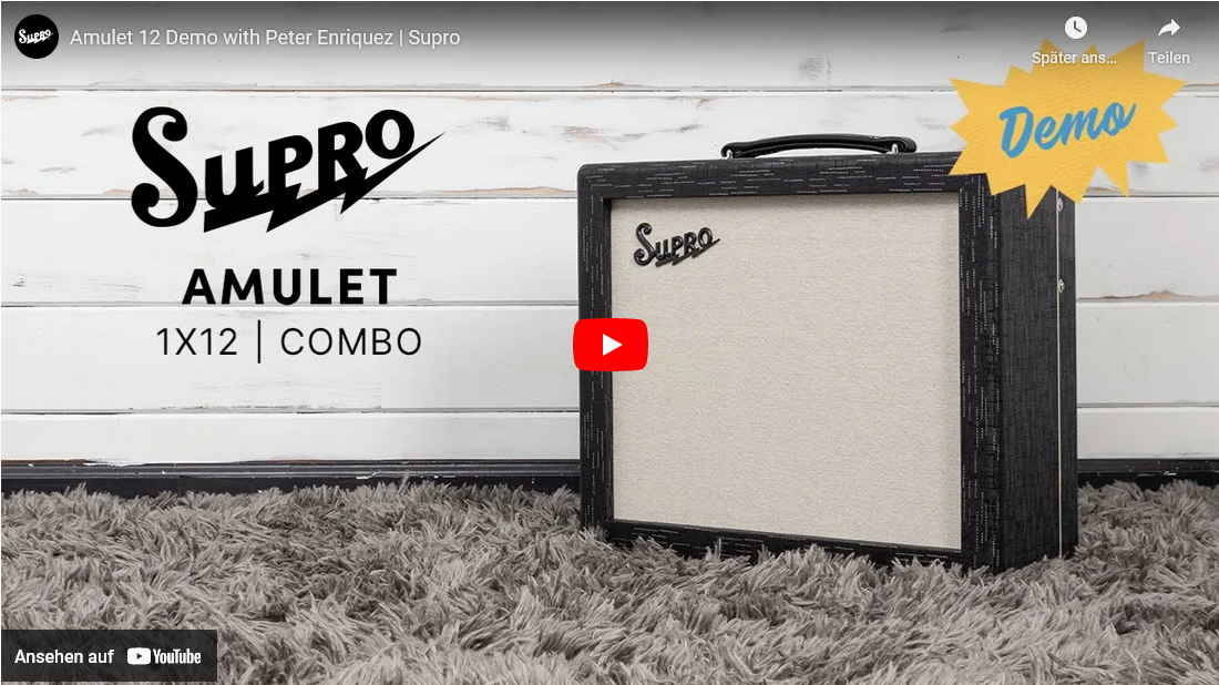 Der Supro Amulet ist ein Vintage-Combo mit Vollröhren-Hall und -Tremolo sowie einem neuen dreifach schaltbaren Leistungsregler. Dieser leichte Röhrenverstärker wurde für Gitarristen entwickelt und bietet 15 Watt, 5 Watt oder 1 Watt Vollröhrenklang über einen in Großbritannien hergestellten Celestion Creamback-Lautsprecher. Der Vorverstärker des Amulet liefert bis zur Mittagsposition des Lautstärkereglers warme, blühende Cleansounds. Nach "Mittag" geht der Sound in den klassischen Supro-Crunch über und macht bei voller Lautstärke einem singenden, geigenartigen Overdrive Platz. Für einen Vintage-Verstärker hat der Amulet einen bemerkenswert hohen Gain-Wert, bietet aber einen Sweet Spot, der nicht übermäßig laut ist.